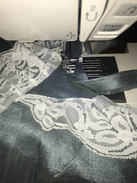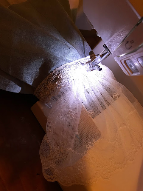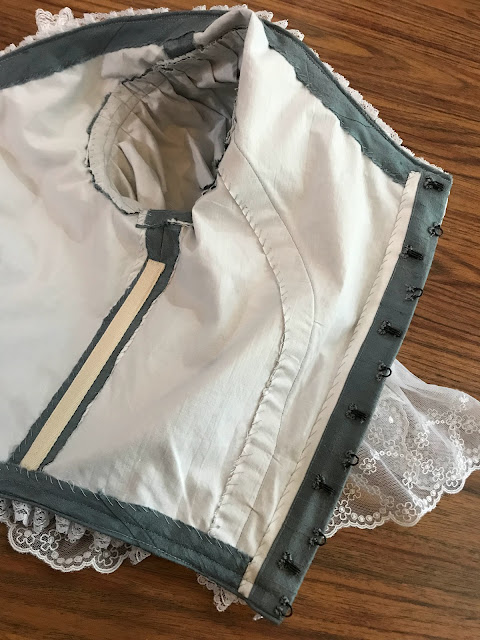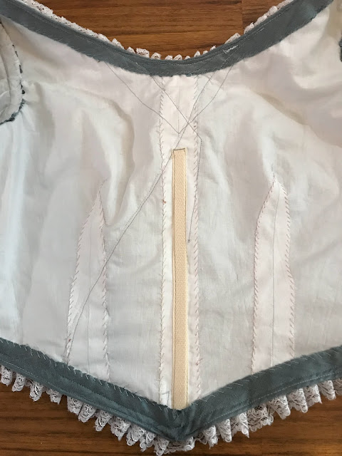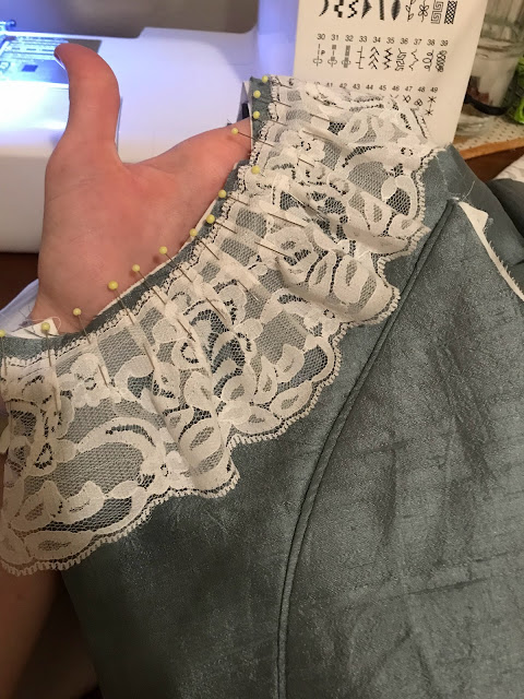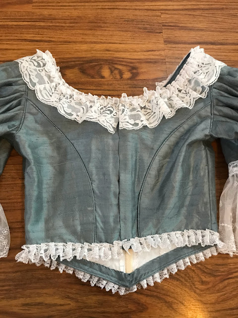 All the lace was sewn on by machine. The stitching blends in to the lace design just fine, and I didn't have time to do much hand sewing on this bodice - I only allowed myself one week to make it!