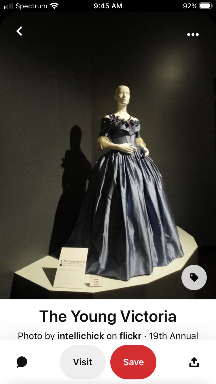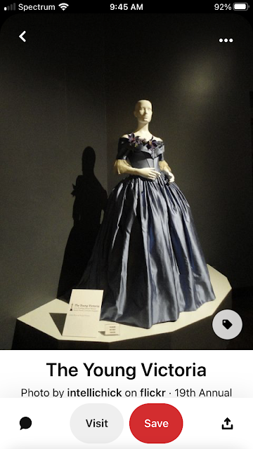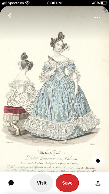 My initial idea was an 1840s evening bodice similar to this one from the movie The Young Victoria. But then I started looking at fashion plates. I came across several prints for 1830's evening gowns with wide ruffles at the bottom of the skirt - just like what my petticoat had.