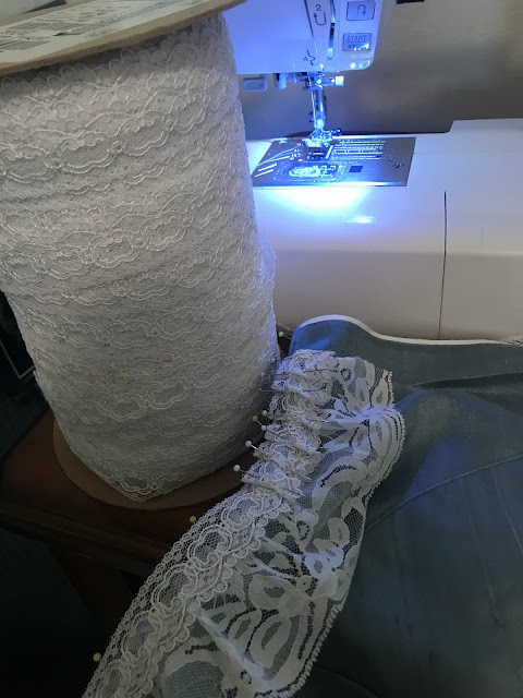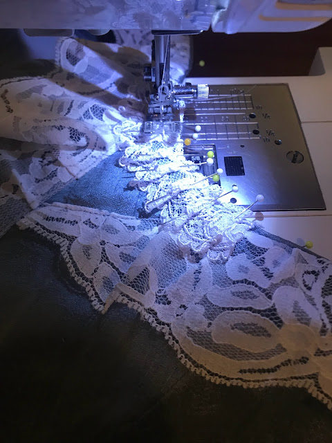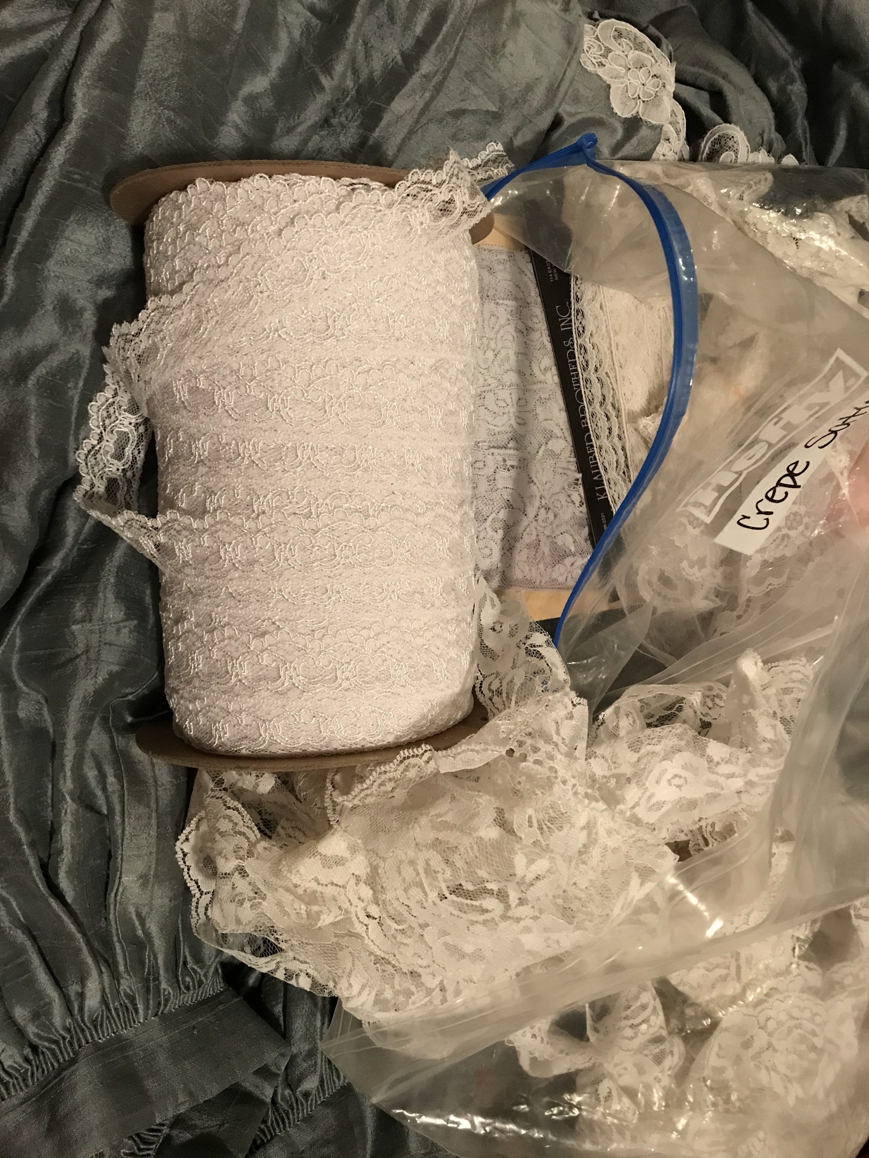 I got this HUGE (over 100 yards!) roll of 1" wide lace trim from the local sewing room that sells donated fabric and notions for $1 per pound. It was just what I needed for the frills on this lace hog of a bodice! (I still have plenty left over for future projects too of course!)