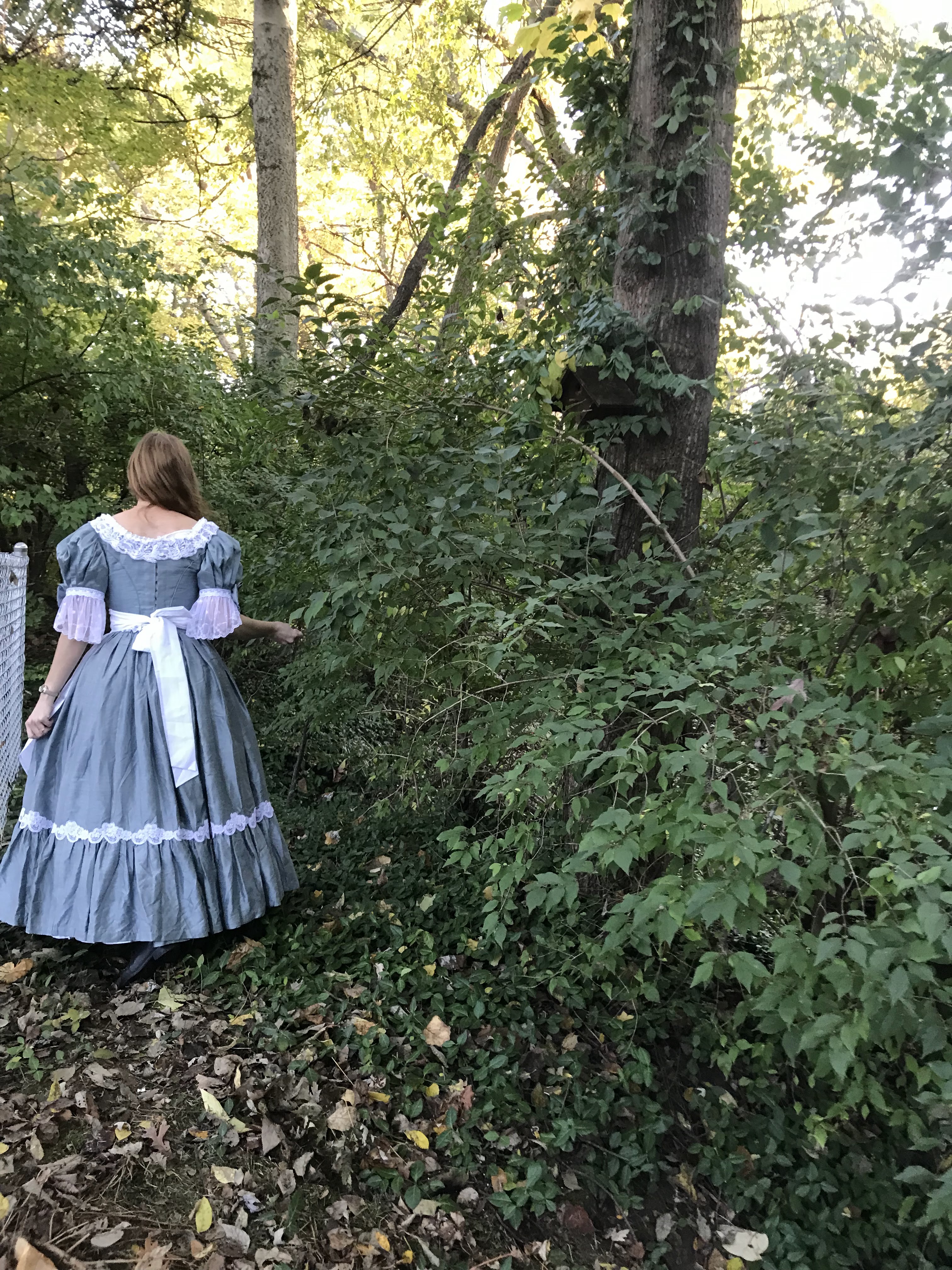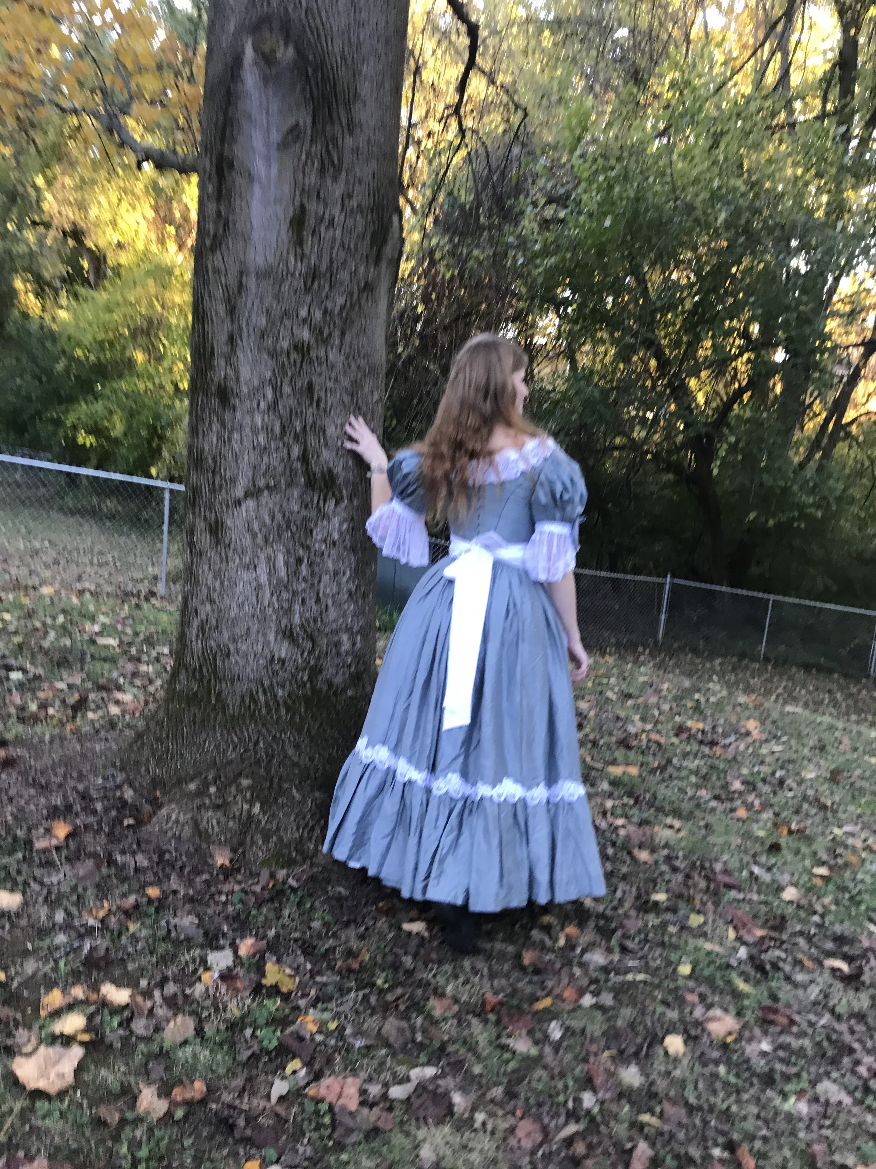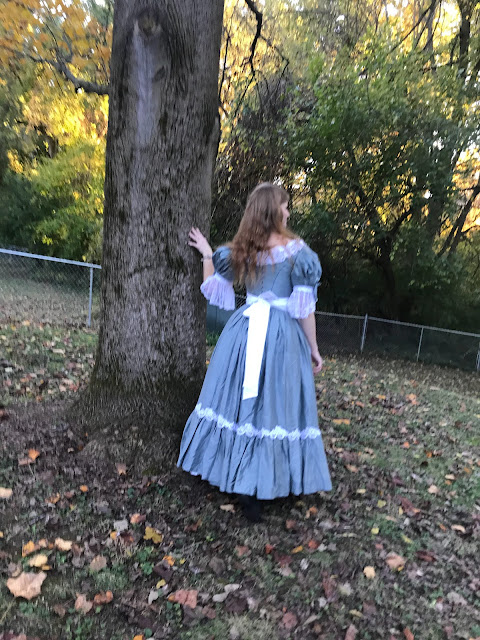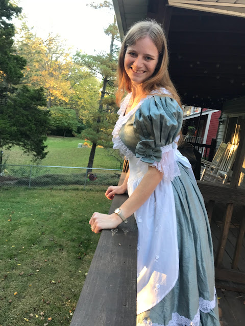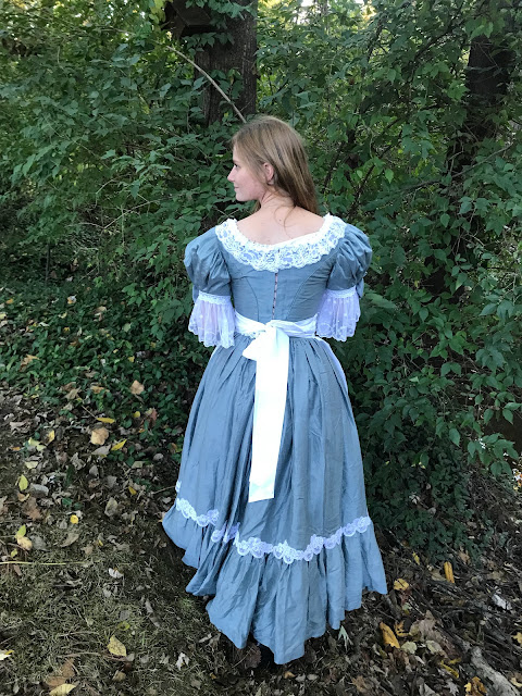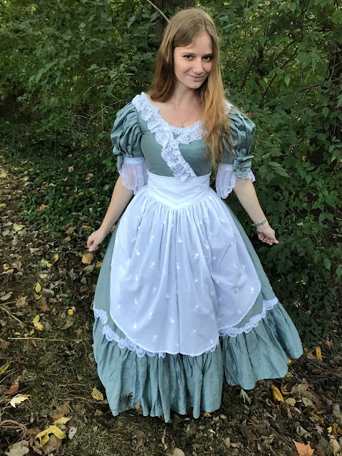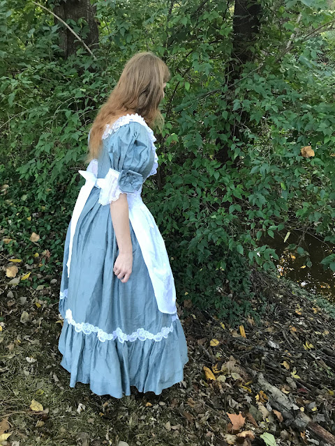 Alice's bodice has short puffed sleeves, a basque (pointed) waist, buttons down the front, and white trim around the neckline. I could certainly make a historical bodice which incorporated a few of these elements! My goal wasn't a "screen accurate" Alice costume, just an Alice-inspired historical costume, if that makes sense.