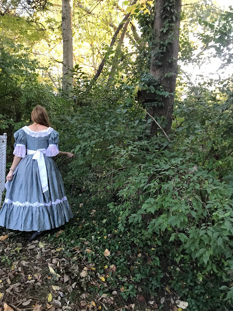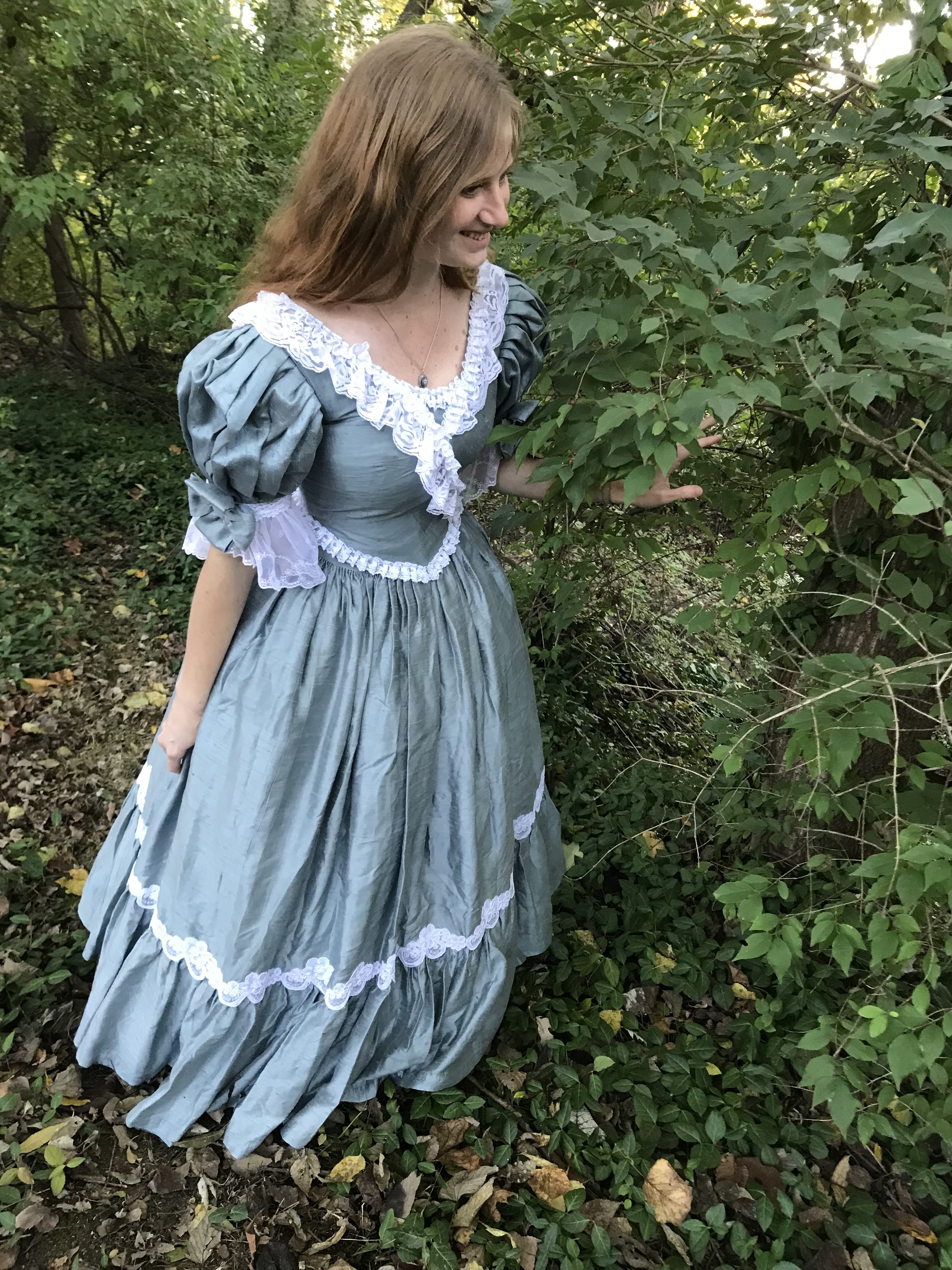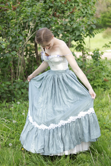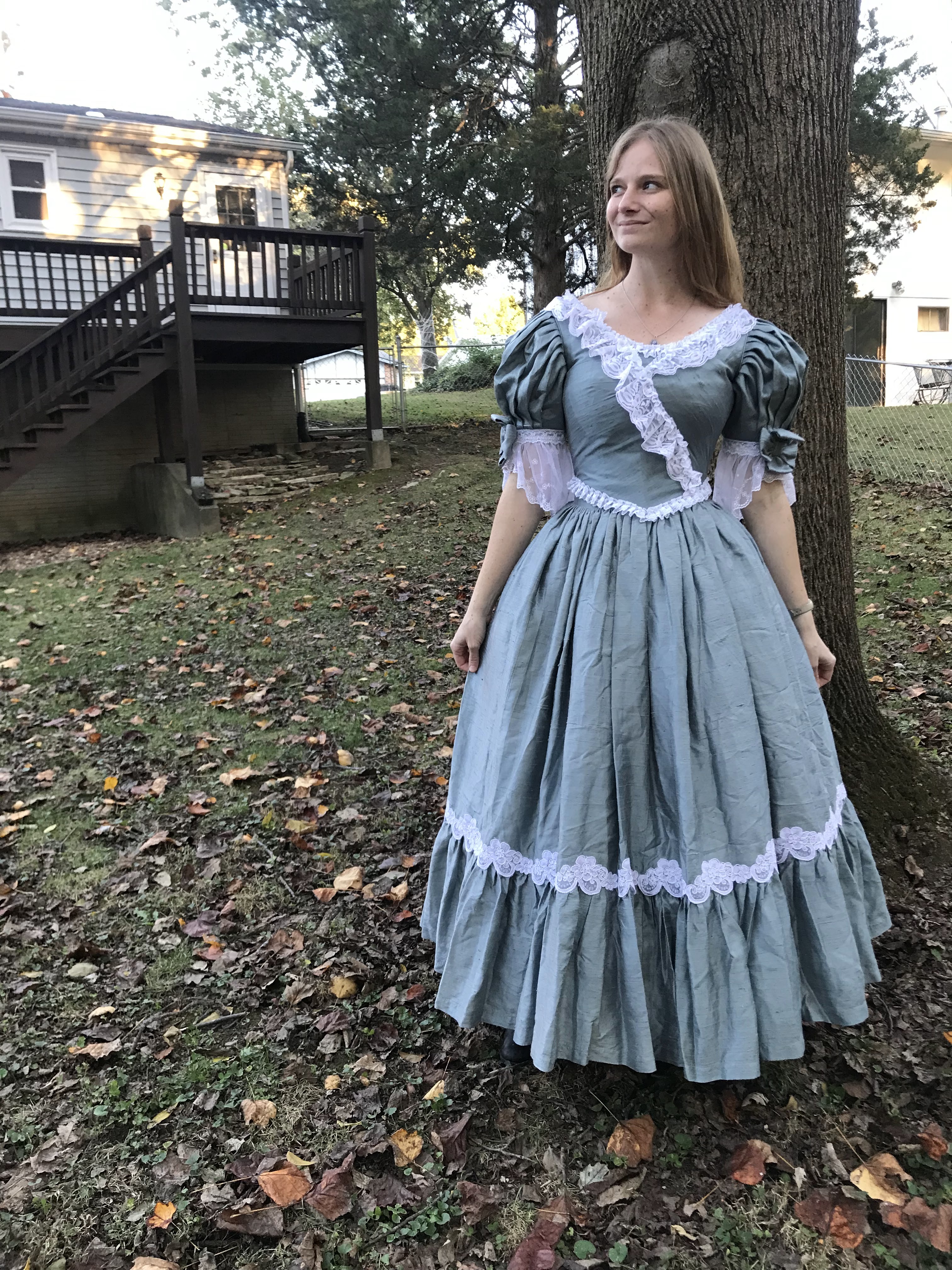 Alice's bodice has short puffed sleeves, a basque (pointed) waist, buttons down the front, and white trim around the neckline. I could certainly make a historical bodice which incorporated a few of these elements! My goal wasn't a "screen accurate" Alice costume, just an Alice-inspired historical costume, if that makes sense.