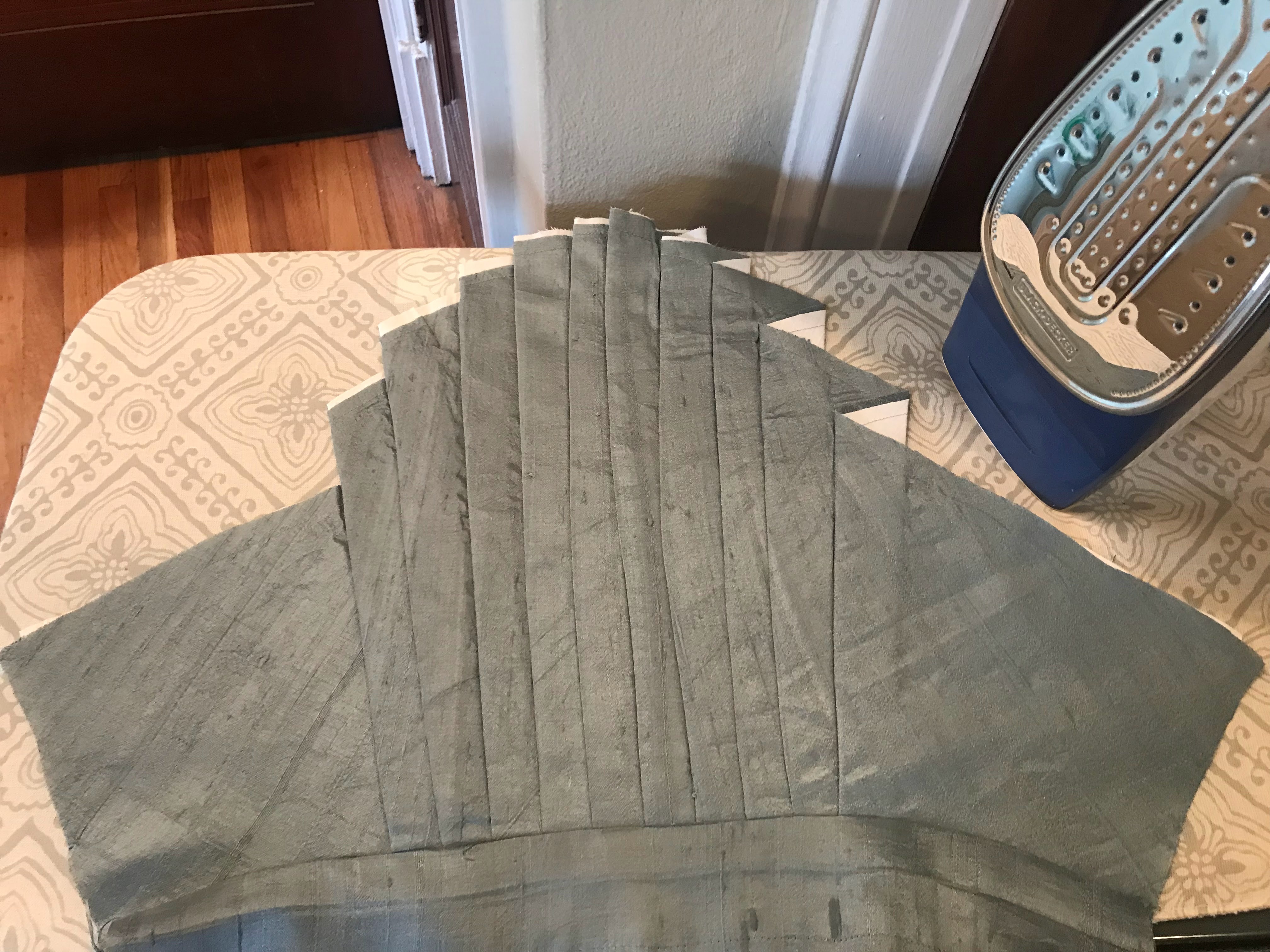 The flat lining was cut from a cotton percale sheet I had on hand, and the outer pieces were all cut from the remaining silk curtain panel. I used heavy duty zip ties for boning at the center front and side seams and made the bone casings from some cotton twill tape I had on hand. The back seams, armscyes, neckline and bottom edge were all piped. I decided to have the back fasten up with hooks and eyes, as that's less fiddley and time consuming than lacing is. Both lacing and hooks and eyes were common back fastenings for evening gowns of this era.