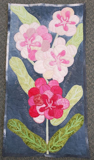I took a picture of a quilt that Helen Anne finished yesterday. This was a piece she made after being inspired in a Jane Sassaman workshop. It's very pretty and I love the way she quilted words into the background. Nicely done!!!