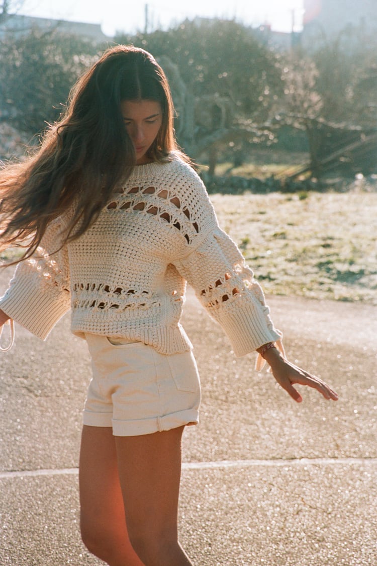 Come summertime — no matter what city you live in — your average public park will be teeming with folx congregating on blankets, surrounding by bikes, babies, books, and Bluetooth speakers. Join the fray in a monochrome look that mixes textures — like a cotton crochet sweater and cream-colored, high-waisted jean shorts. (Don’t fear the grass stains — just roll with it. Literally.)
